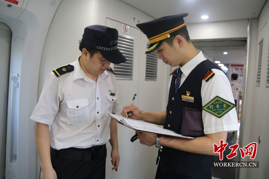 列车长陈鑫和随车机械师对列车上的设备设施进行确认,在确认后进行签字。