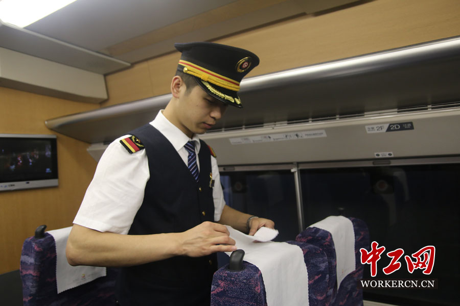 列车长陈鑫整理座椅。