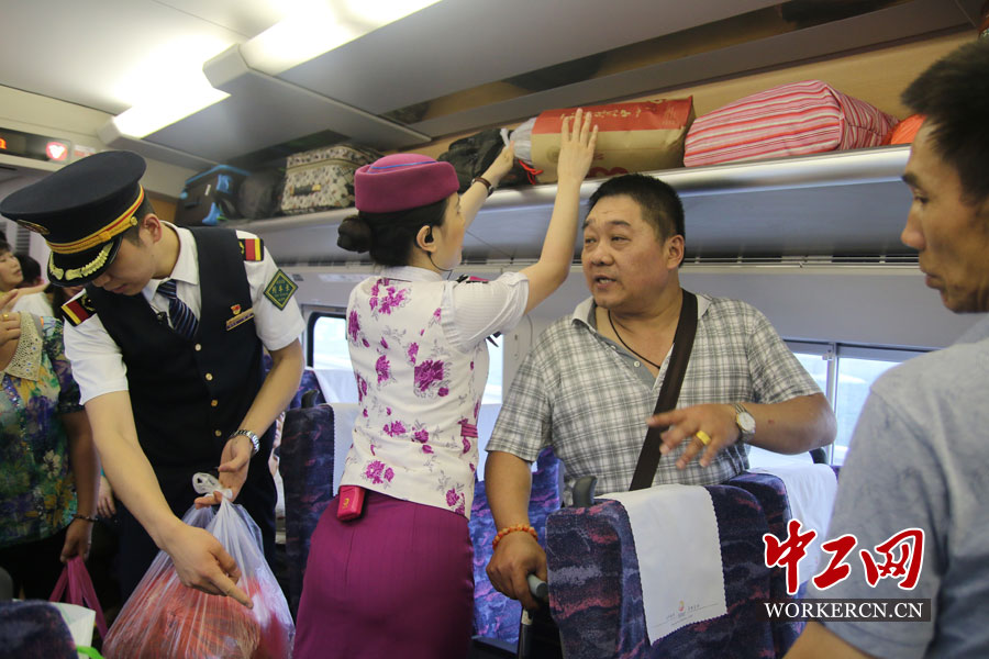 陈鑫和动妹帮助旅客把行李包放到行李架上。