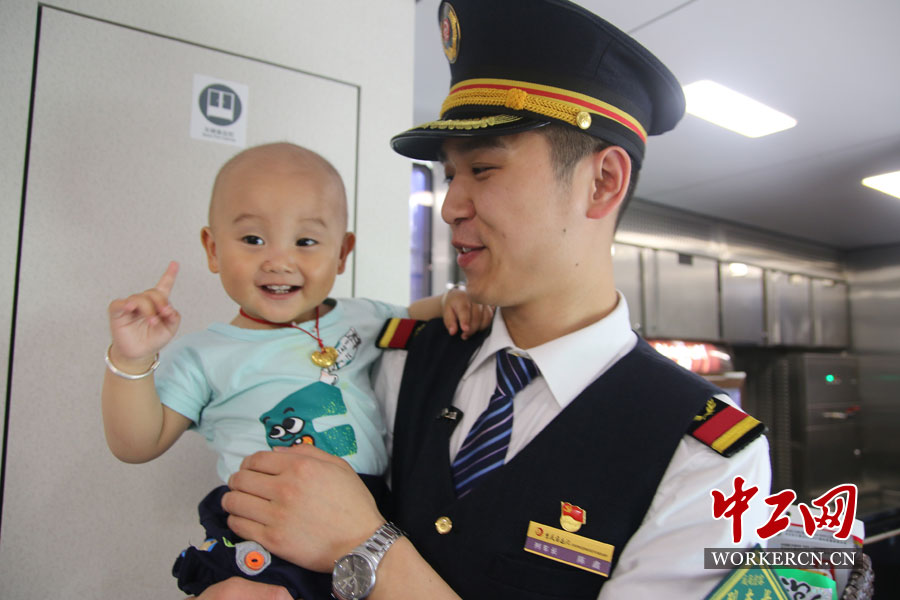 小旅客和列车长快乐的合影。