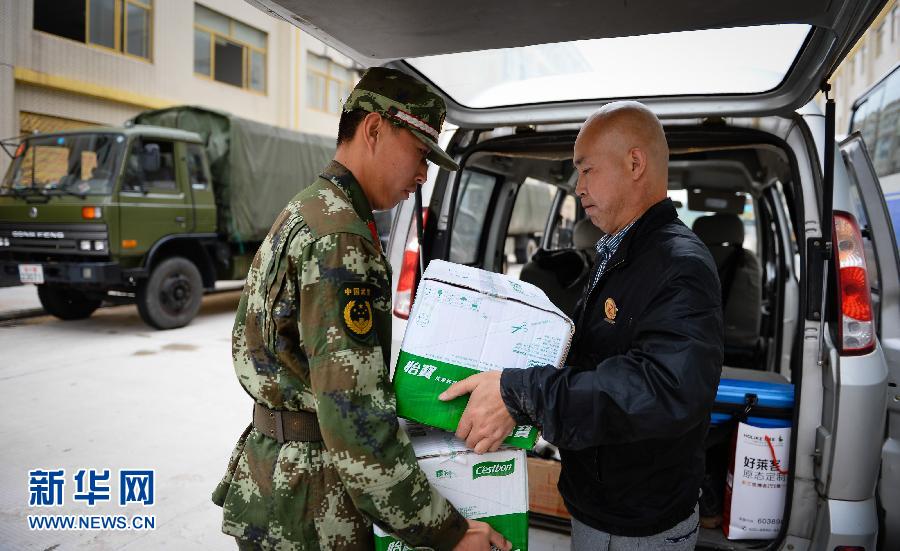 6月4日,在湖北监利某武警驻扎基地,肖建民把矿泉水送到一名武警战士手中。 45岁的肖建民是湖北监利一名普通市民,平日在当地经营一家眼镜店。自6月2日一早听闻“东方之星”号客船在长江监利段翻沉后,他自发辅助救援工作,先后自费购买400多箱矿泉水和60多箱方便面,开车送往各大酒店、武警官兵驻扎基地、高速出口,供武警官兵及“东方之星”乘客家属无偿使用。新华社记者李响摄