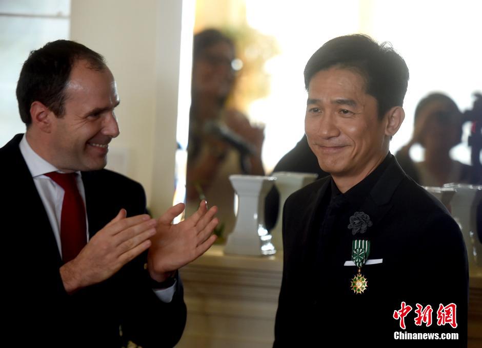 6月8日,香港艺人梁朝伟(右)在法国驻港领事官邸接受法国驻港澳总领事柏雅诺(左)颁发的“法国艺术与文学军官勋章”,成为首位获得该勋章的华人男演员。柏雅诺称,梁朝伟多年来凭借独树一帜的表演风格与个人魅力赢得法国观众喜爱,不仅对中法文化交流贡献良多,更对华人演员的海外影响力有积极的推动意义。中新社发 张宇 摄