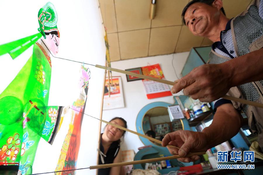 6月4日,在辽宁省大连市瓦房店得利寺镇,复州皮影国家级代表性传承人宋国超表演皮影戏。新华社发(张春雷 摄)