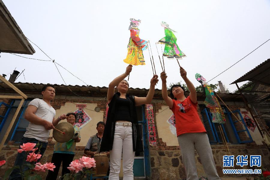 6月4日,在辽宁省大连市瓦房店得利寺镇,复州皮影国家级代表性传承人宋国超(后排右一)在和徒弟王靖波(前左)、王淑琴(前右)及乐队一起排练。新华社发(张春雷 摄)