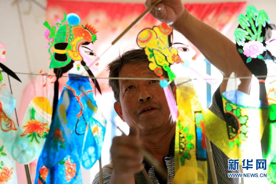 6月4日,在辽宁省大连市瓦房店得利寺镇,复州皮影国家级代表性传承人宋国超在摆弄自己制作的皮影。新华社发(张春雷 摄)