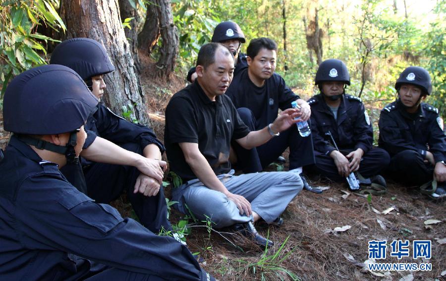 高明(左三)和同事在中缅边境的森林里研究如何堵截毒贩(2014年7月8日摄)。
