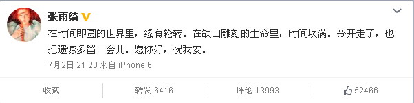 7月2日晚,张雨绮微博发文宣布与王全安离婚。张雨绮写道:“在时间即圆的世界里,缘有轮转。在缺口雕刻的生命里,时间填满。分开走了,也把遗憾多留一会儿。愿你好,祝我安。”
