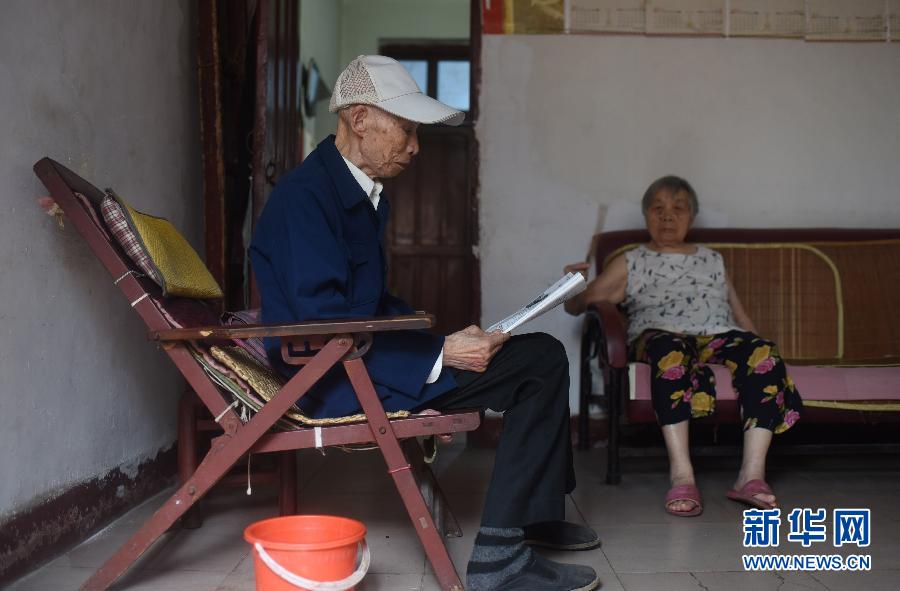 6月29日,王忠在家中看杂志,此时室外已是接近40摄氏度高温,他在家中仍然穿着外套和厚袜子保暖。新华社记者 李尕 摄