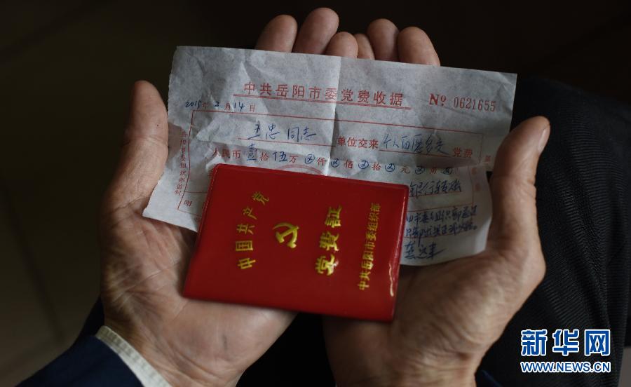 6月29日,王忠手捧15万元“特殊党费”的收据和党费证。新华社记者 李尕 摄