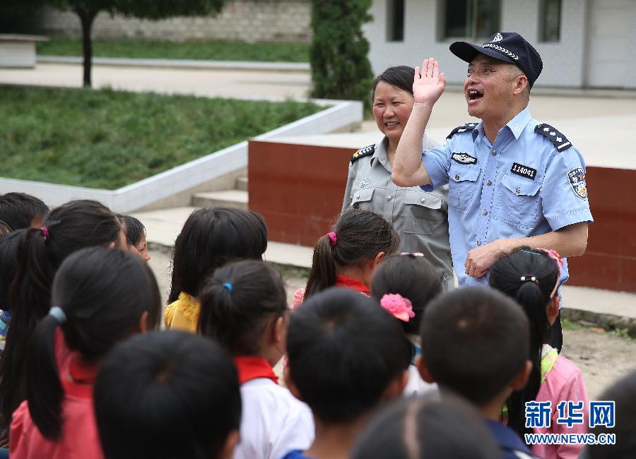 在贵州省六盘水市陡箐乡猴儿关大山上的茨冲小学,“盲警”潘勇在向小学生做铁路安全宣讲,46的妻子陶红英站在丈夫的身边(6月30日摄)。新华社记者王申 摄