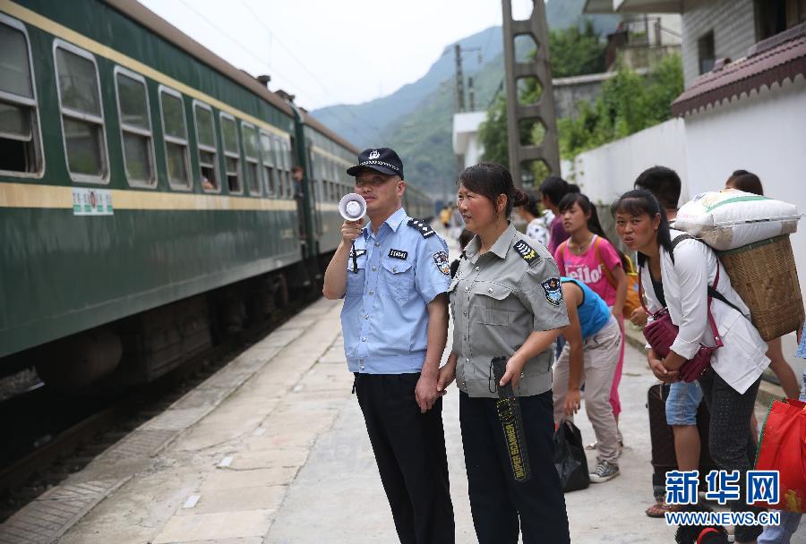 在贵州省六盘水市陡箐乡猴儿关大山上的茨冲车站,陶红英陪伴着“盲警”丈夫潘勇在向旅客做铁路乘车的安全宣传(6月30日摄)。 新华社记者王申 摄