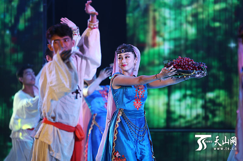 7月8日,祖力阿亚提·伊斯坎德正在与舞伴一起表演《吐鲁番盛典》。 李瑞摄