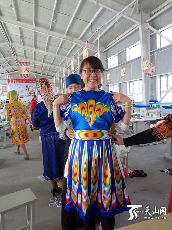 肖爱民老师展示努尔买买提为她制作的艾德莱斯裙。马少宾摄