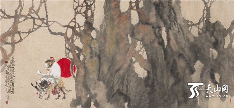 新疆画家李志天用桑皮纸创作的中国画《东方红》别有风味。