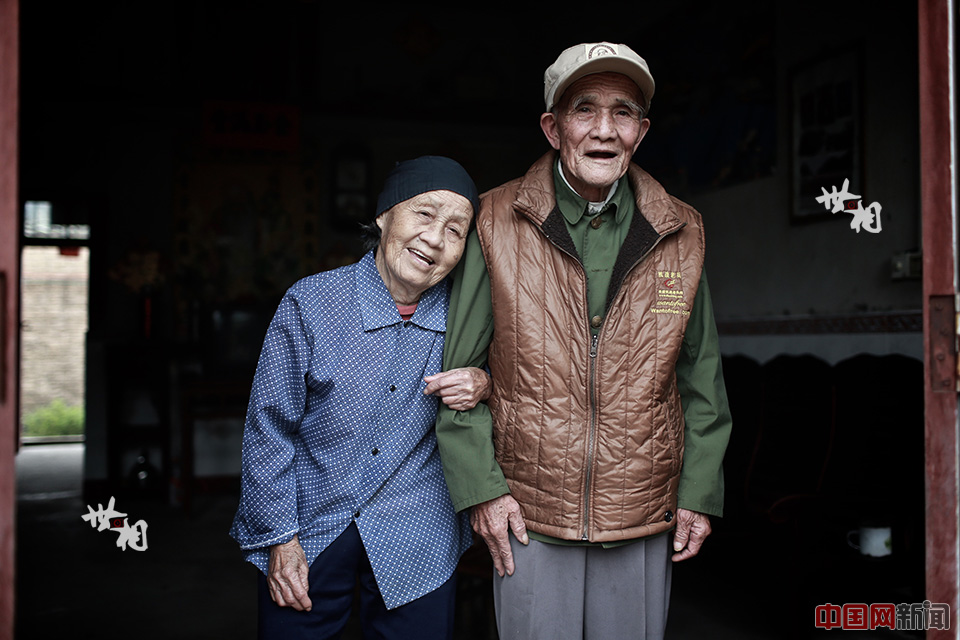 秦秋荣与老伴在家门口合影。秦秋荣喜欢穿一件印有“抗战老兵”字样的短袖。他觉得,他为自己当过兵,打过仗,感到无比的自豪。