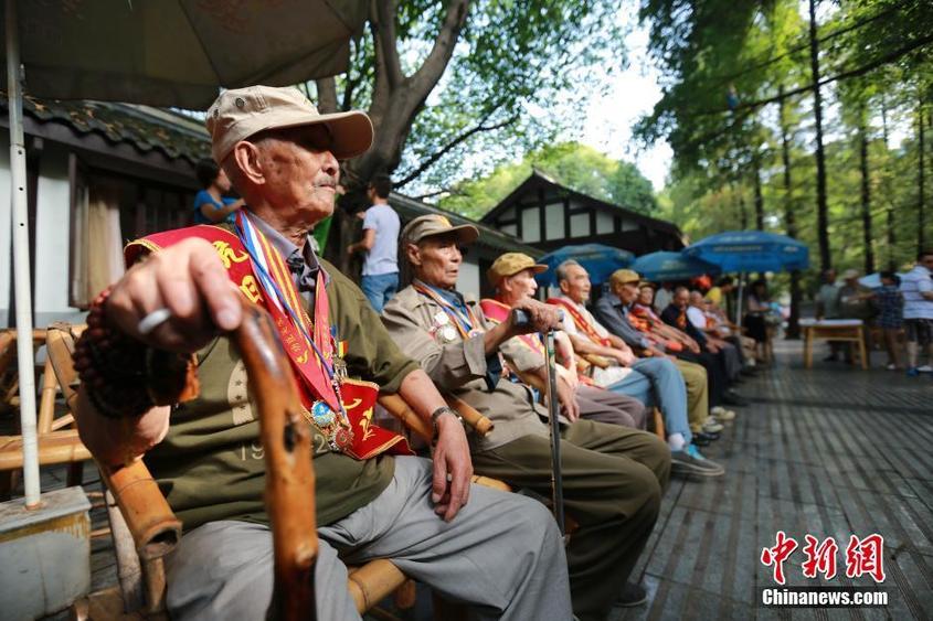 8月15日,98岁抗战老兵马定新在成都“川军抗日阵亡将士纪念碑”前用自己拐杖还原“拼刺刀杀鬼子”。当日是日本宣布无条件投降纪念日,成都当地民众以及在川的10余名抗战老兵在此以各种方式纪念抗战胜利70周年。张浪 摄