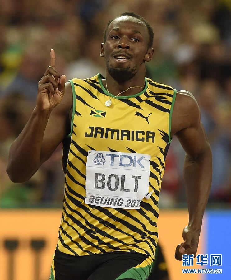 8月27日,博尔特在夺冠后庆祝。当日,在北京国际体育场“鸟巢”举行的2015年国际田联田径世界锦标赛男子200米决赛中,牙买加选手博尔特以19秒55的成绩夺得冠军。新华社记者公磊摄