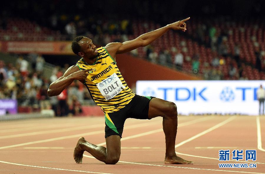 8月27日,博尔特在夺冠后庆祝。当日,在北京国际体育场“鸟巢”举行的2015年国际田联田径世界锦标赛男子200米决赛中,牙买加选手博尔特以19秒55的成绩夺得冠军。新华社记者李钢摄