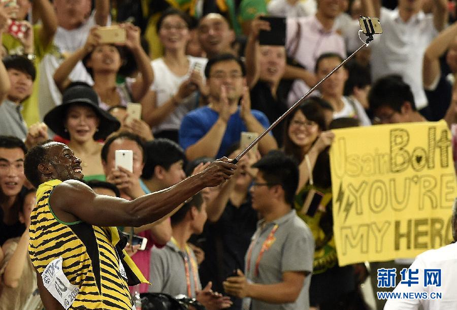 8月27日,博尔特在夺冠后自拍庆祝。当日,在北京国际体育场“鸟巢”举行的2015年国际田联田径世界锦标赛男子200米决赛中,牙买加选手博尔特以19秒55的成绩夺得冠军。新华社记者公磊摄