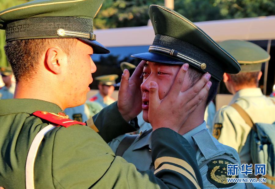 9月6日,秦皇岛边防检查站退伍即将返乡的老兵在向战友道别。当日,河北公安边防部队100多名退伍老兵告别警营,踏上返乡路。新华社记者 杨世尧 摄