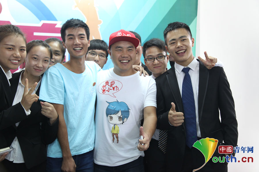 “红薯王子”孙国秀在四川希望汽车职业学院分享过程中与青年学生互动。中国青年网记者李延兵摄