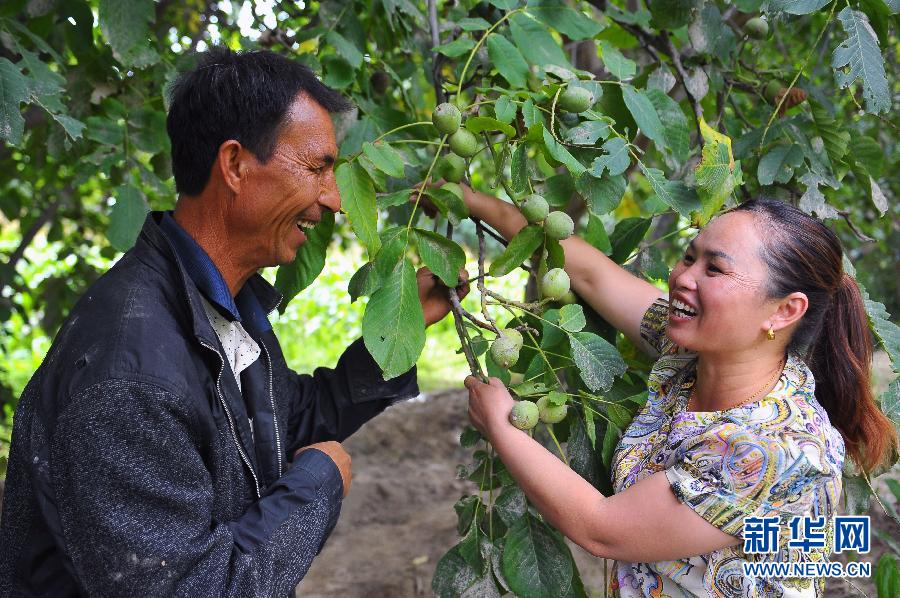 在新疆和田地区皮山县木奎拉乡达格里村,尤良英(右)在麦麦提图如普·穆萨克家的核桃地里给他传授核桃种植管理技术(9月3日摄)。