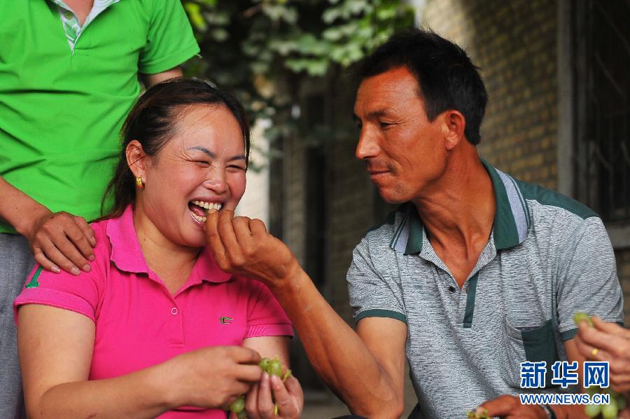 麦麦提图如普·穆萨克(右)到新疆生产建设兵团一师阿拉尔市十三团十一连看望汉族大姐尤良英(8月31日摄)。新华社记者姜琳摄