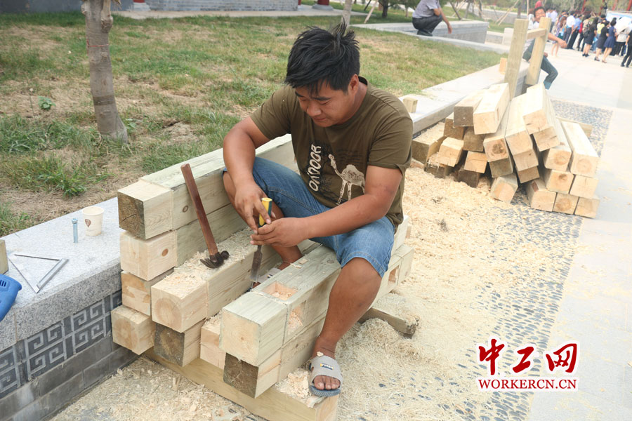 农民工正在做木活。中工网记者朱晶晶摄。