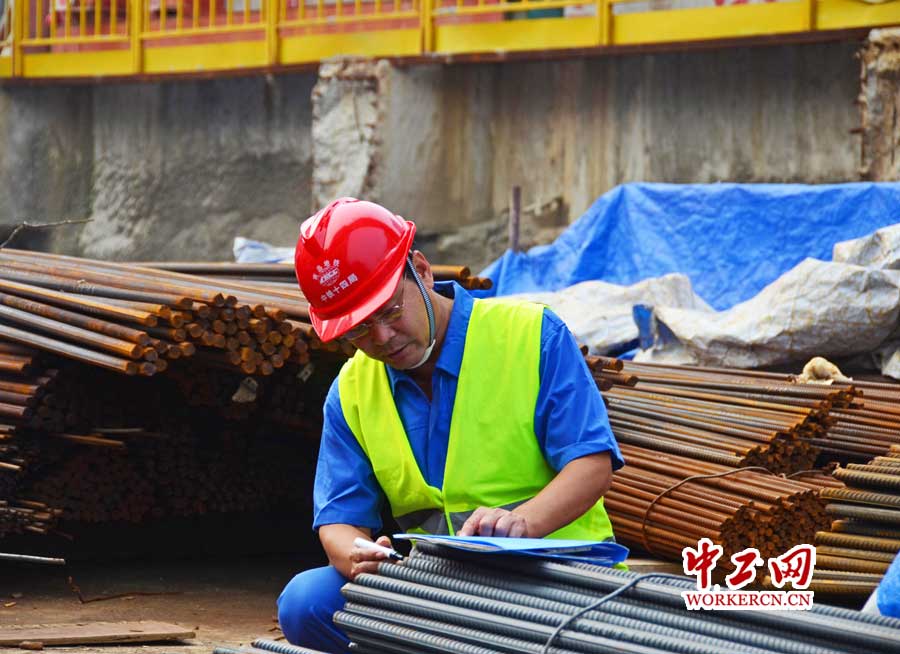 钢筋大多都是深夜或凌晨到场。钢筋到场后,老信就要点验到场的钢筋。“点验钢筋是个细致活儿,要用记号笔一根一根划上印记,时间长了眼睛就有点花。”对于这项工作,老信始终做到一丝不苟。