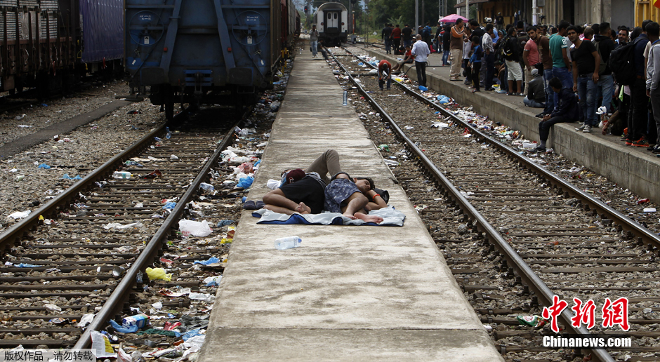 在马其顿火车站,两个难民躺在轨道之间狭小的站台上睡着了。在他们周边,还有大量的难民等着挤上火车进入欧洲其他国家。