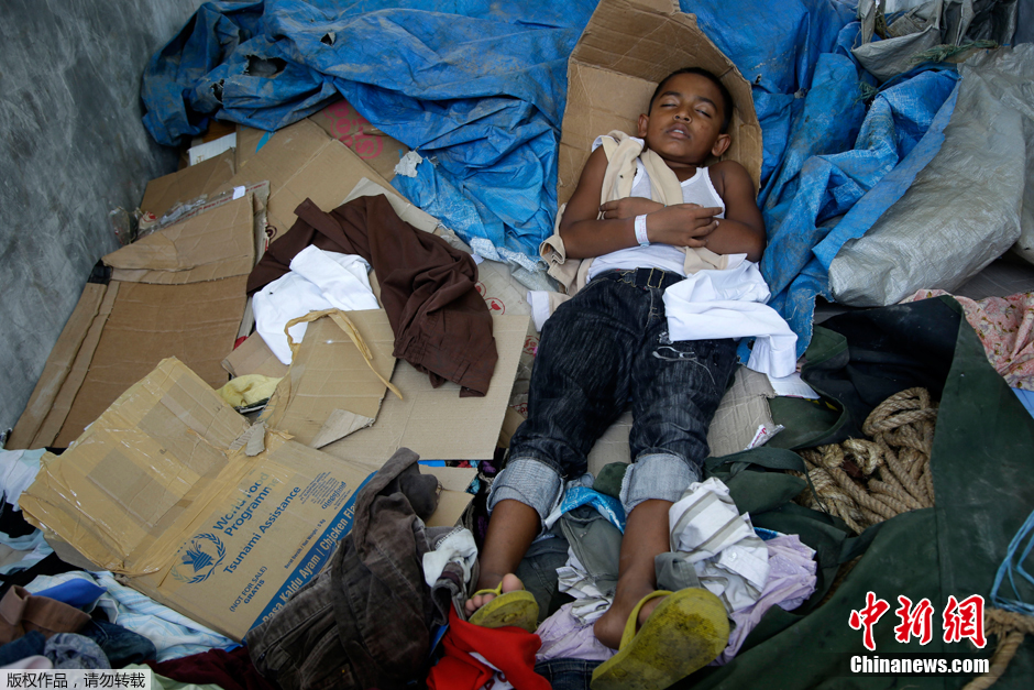 除了叙利亚难民,印尼的罗兴亚人也遭受着流亡的命运。在印尼亚齐省,一个罗兴亚小难民在一堆废纸板搭建成的临时避难所里进入梦乡。