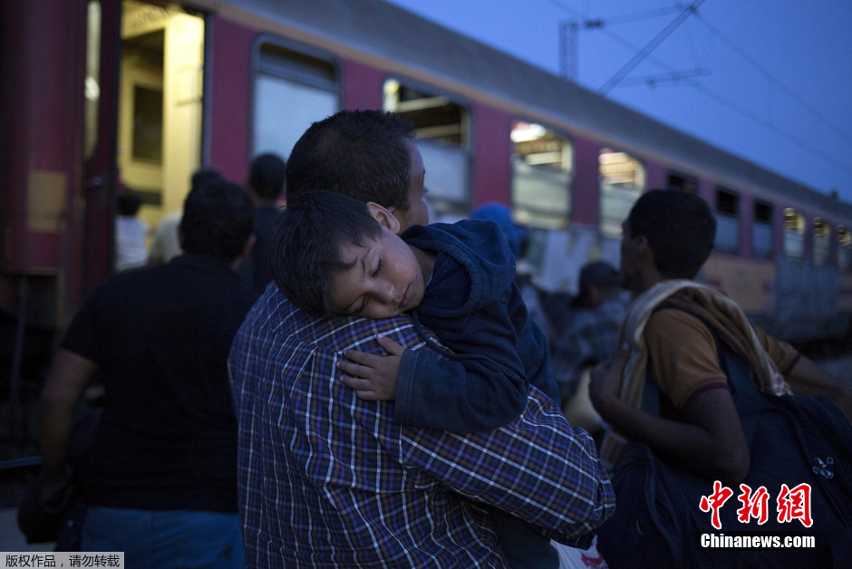当地时间9月5日,在马其顿的一个火车站,一个小朋友趴在父亲的身上睡着了。他们父子二人跟大量在车站等待的人一样,想要搭上穿越希腊边境的火车。