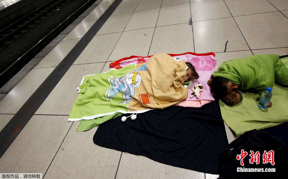 两名来自叙利亚难民家庭的小朋友在法拉克福火车站的站台上睡着了,经过了漫长的跋涉,他们和父母终于幸运的搭上了从布达佩斯到法兰克福的火车。一到站,他们就马上躺在地上睡着了。
