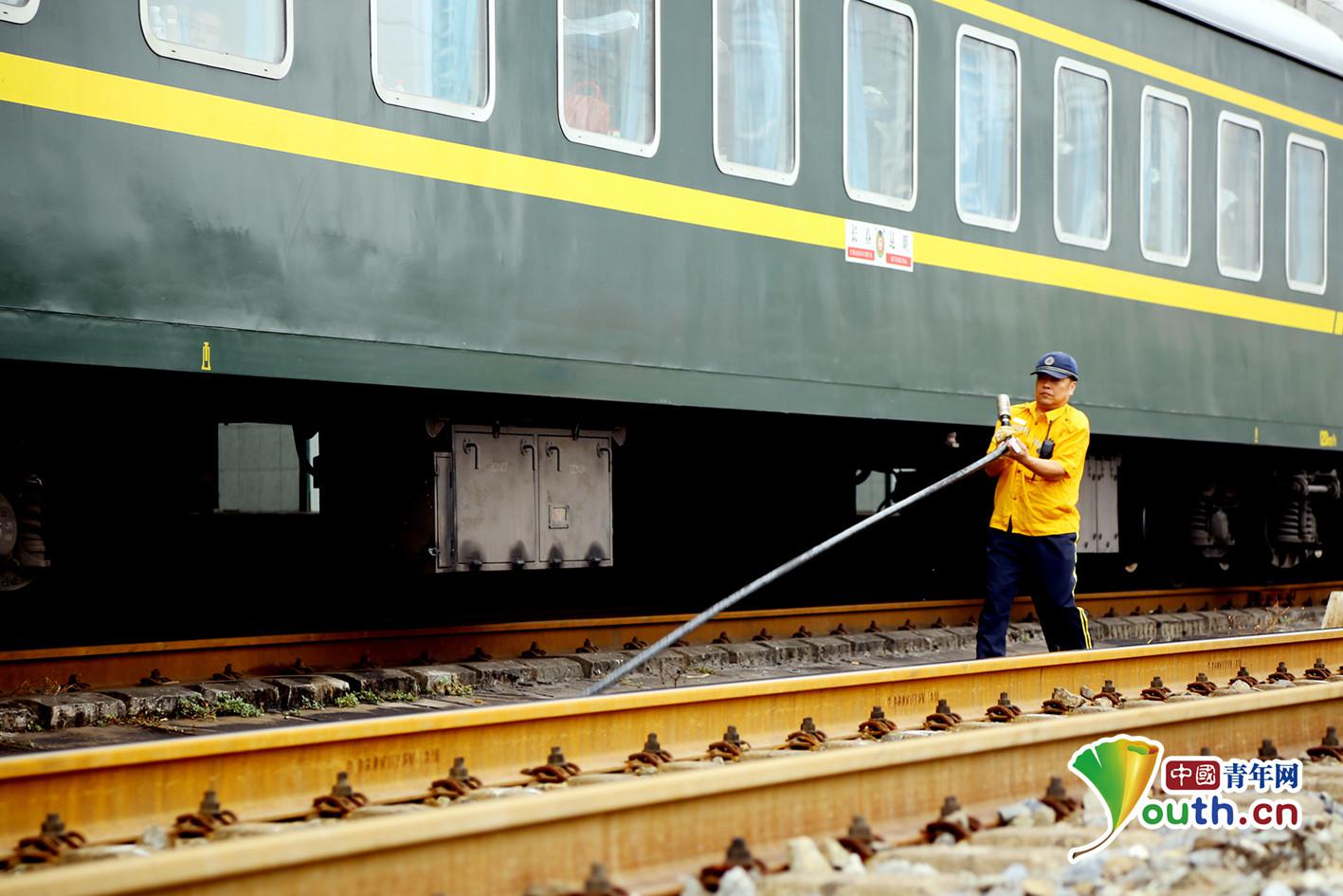 肖建国正在忙碌着给过往列车上水。中国青年网通讯员潜继承摄