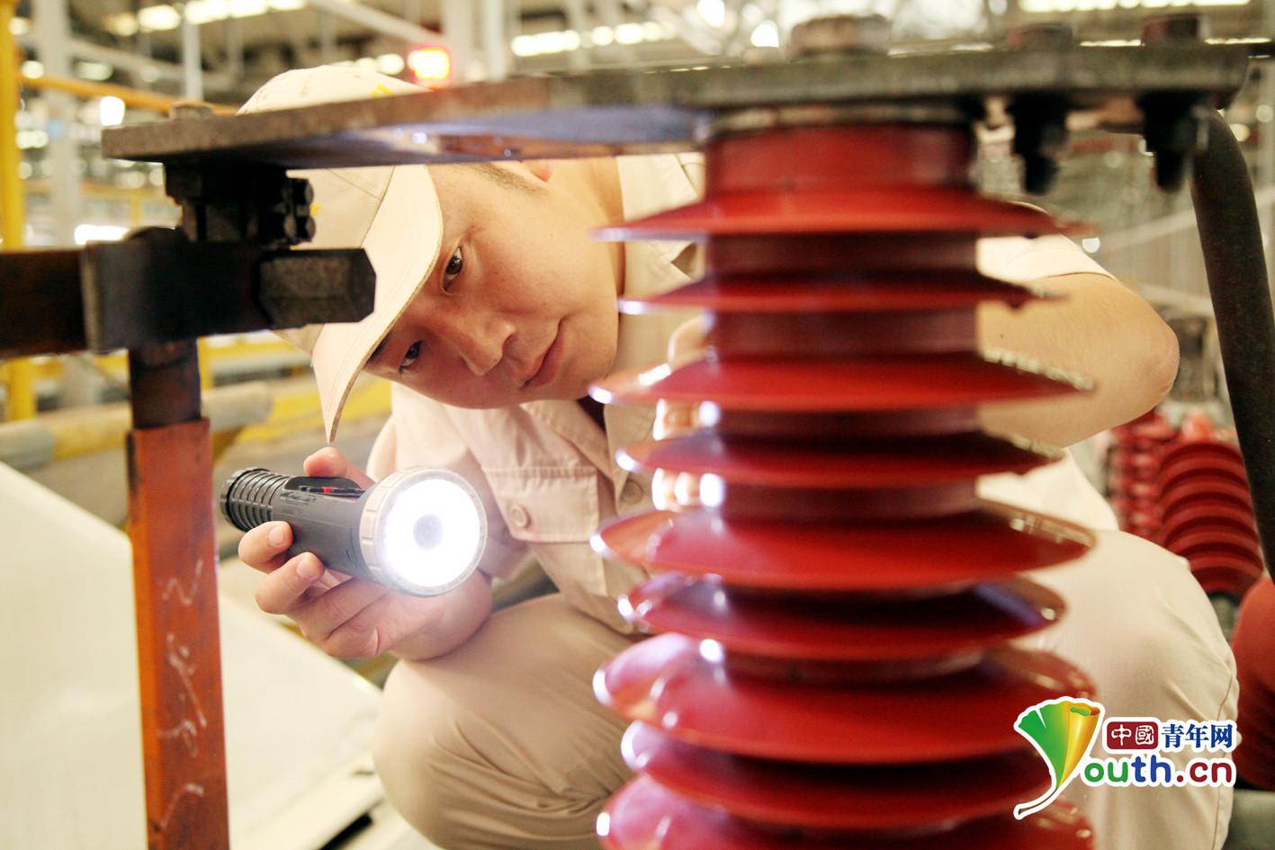 郭庆正在对动车组受电弓绝缘子进行复查,确保其无破损、无污物。中国青年网通讯员王琪摄