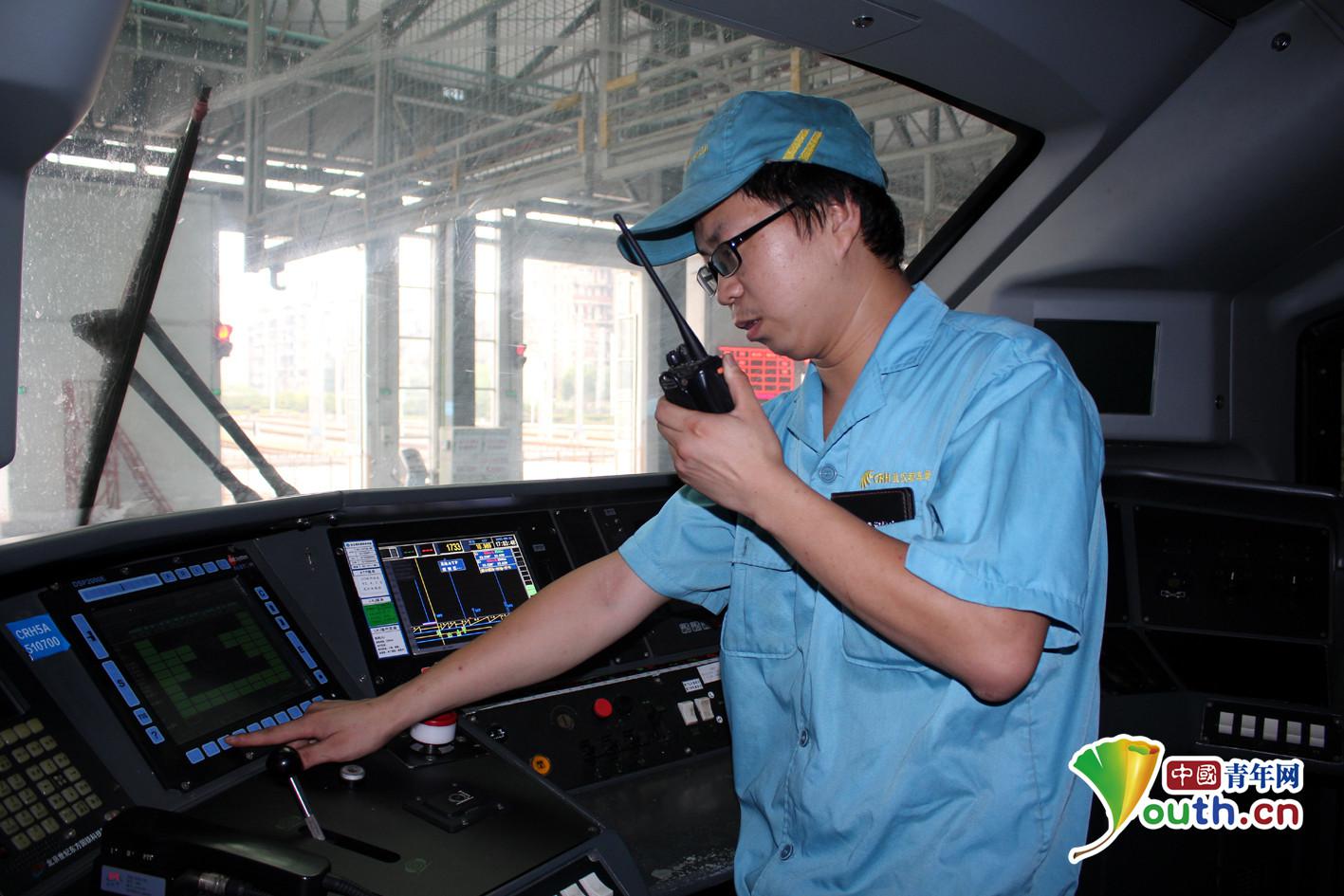 10月1日一早,杜旭峰正在通过司机室MON屏对即将出库上线的动车组的状态进行确认。中国青年网通讯员刘朝斌摄