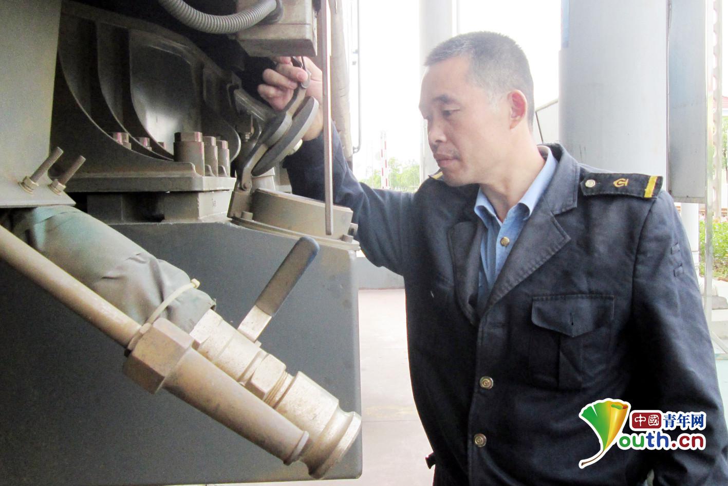 吕国庆在检查机车砂箱存砂量。中国青年网通讯员郭永亮摄