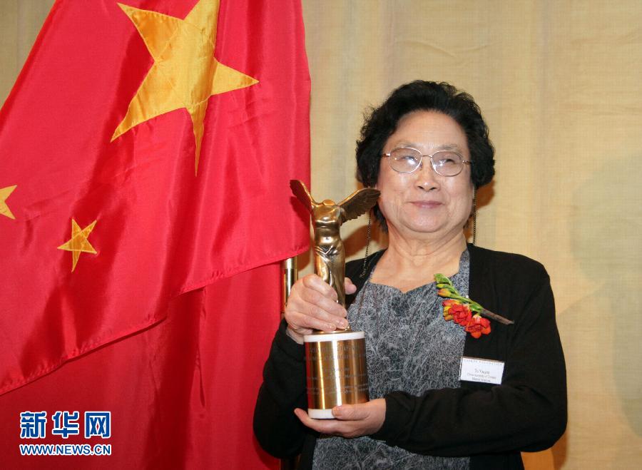 这是2011年9月23日,屠呦呦在美国纽约举行的拉斯克奖颁奖仪式上展示奖杯和证书。新华社记者王成云摄