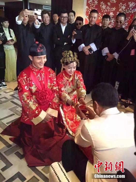 2015年10月8日,上海,黄晓明、Angelababy婚礼在即,黄晓明、baby穿旧式大红喜服敬酒笑不拢嘴。中新社记者 申海 摄