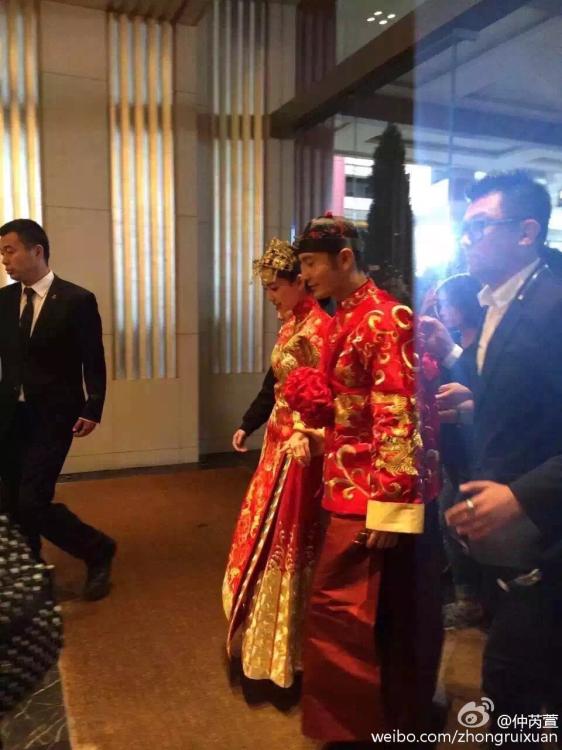2015年10月8日,上海,黄晓明、Angelababy婚礼在即,黄晓明、baby穿旧式大红喜服敬酒笑不拢嘴。图片来源:仲芮萱认证微博