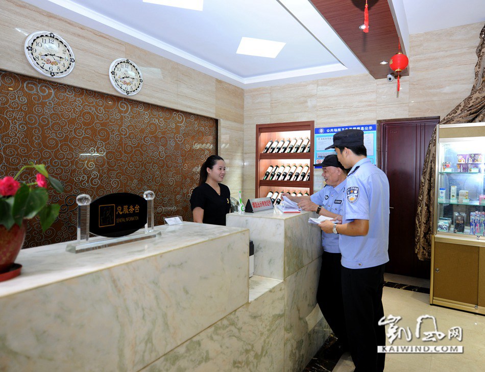 经过一家旅馆,老陶走进去检查台帐,向前台的小姑娘反复强调核对登记住宿人员的重要性,小姑娘看着这么负责的老民警,也在认真地倾听着。 (凯风网供图)