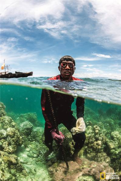 在他们的居住地,戴着自制木头眼镜的摩恩刚刚潜完水,他总是用一根拆轮胎用的铁棒去搜寻海中珍宝。