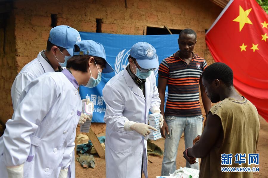 近日,在利比里亚绥德鲁市附近村庄,中国第18批赴利比里亚维和部队医疗分队医生为当地村民义诊。绥德鲁是利比里亚第二大城市,但市区就横竖两条马路,十几万人口大多散居在原始森林中或马路两边的房屋里。自12年前参加联合国在利比里亚维和任务以来,中国驻利比里亚维和部队工兵分队和医疗分队的营地就一直设在这里,两个营地都是用塑料板临时搭建,非常简陋。新华社记者孙瑞博摄