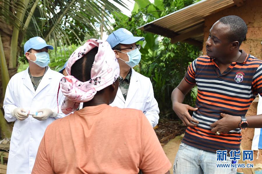 11月1日,在利比里亚绥德鲁市附近村庄,中国第18批赴利比里亚维和部队医疗分队医生李海军(中)和罗涛(左)在翻译帮助下为当地村民义诊。绥德鲁是利比里亚第二大城市,但市区就横竖两条马路,十几万人口大多散居在原始森林中或马路两边的房屋里。自12年前参加联合国在利比里亚维和任务以来,中国驻利比里亚维和部队工兵分队和医疗分队的营地就一直设在这里,两个营地都是用塑料板临时搭建,非常简陋。新华社记者孙瑞博摄