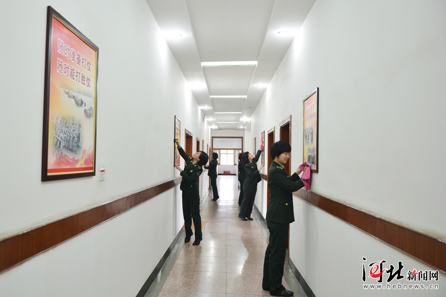 干净整洁的楼道内,吕晶最后一次带领战友为通信站打扫卫生。