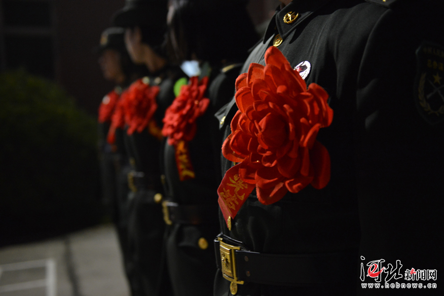 部队为每一位即将退伍的士兵胸前都佩戴了大红花,并印有“光荣”二字。这一刻,胸前的大红花在灯光的照射下显得十分鲜艳。