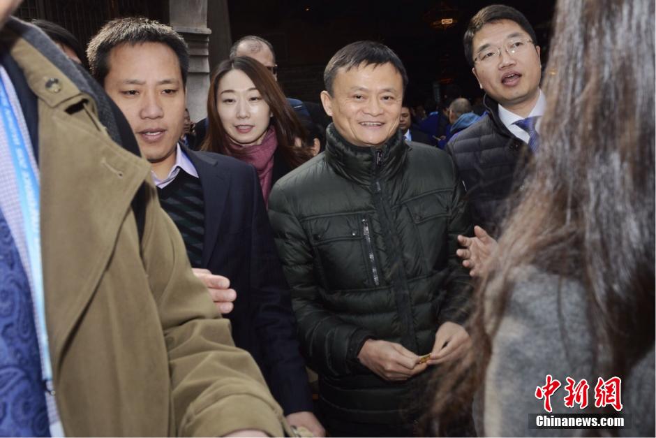 2015年12月16日,浙江省嘉兴市,当日中午,第二届世界互联网大会·乌镇峰会开幕式结束后,马云、雷军、李彦宏、张朝阳、柳传志等互联网科技大咖们从会场走出,向久等的“粉丝”们招手。图为马云。 图片来源:视觉中国