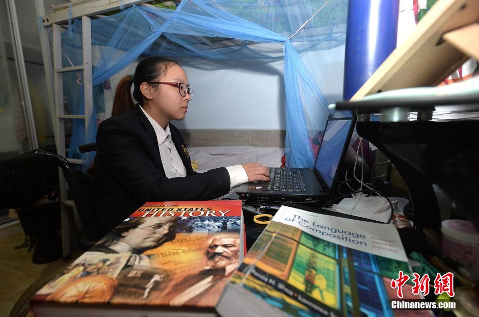 2015年12月16日,成都都江堰市一学校,黄梅花在家里练习瑜伽。日前,在5.12汶川大地震中受伤被截肢双腿的成都高三女孩黄梅花,被加拿大皇家飞行学校破列录取。明年2月黄梅花将在温哥华进行为期三周的飞行体验课程。图片来源:视觉中国