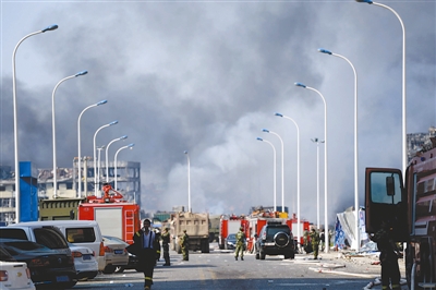 2015年8月13日,天津滨海新区爆炸事故现场,消防官兵在爆炸核心区等候救援指令。该事故造成173人遇难,其中消防人员104人。