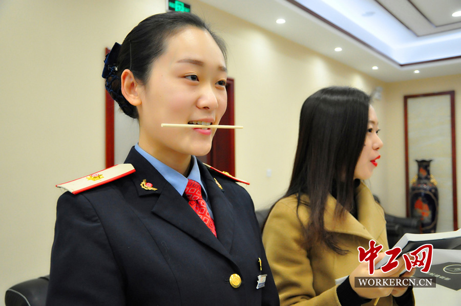 图为客运人员在老师的指导下进行微笑练习。